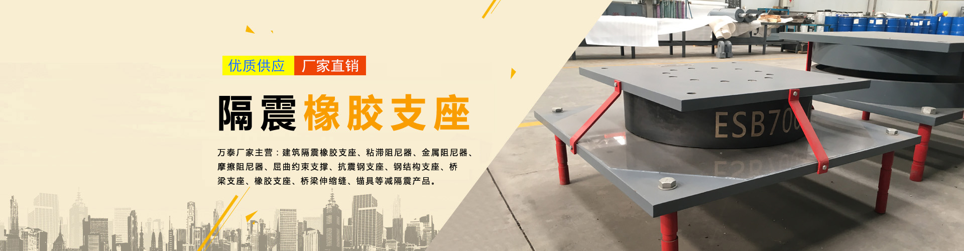 隔震產品系列 建筑隔震支座 鉛芯支座 減震產品系列 屈曲約束支撐 金屬阻尼器 摩擦阻尼器 連梁阻尼器 黏滯阻尼器 粘彈阻尼器 粘滯阻尼墻 調諧質量阻尼器 網架及鋼結構支座系列 抗震鋼支座 球鉸支座 連廊支座 網架鋼支座 網架橡膠支座 橋梁支座系列 盆式橡膠支座 板式橡膠支座 球型支座 高阻尼隔震支座 水平分散力支座 鐵路支座 伸縮裝置系列 型鋼伸縮縫 模數式伸縮縫 梳齒板伸縮縫 TST伸縮縫 預應力產品系列 預應力錨具 波紋管 其他工程產品 止水條 止水帶 橡膠壩 護欄支架 泄水管 閉孔泡沫板 防水卷材 土工材料 金屬絲網 支座配套鋼板 橡膠緩沖墊塊 路橋養護施工 路橋養護施工